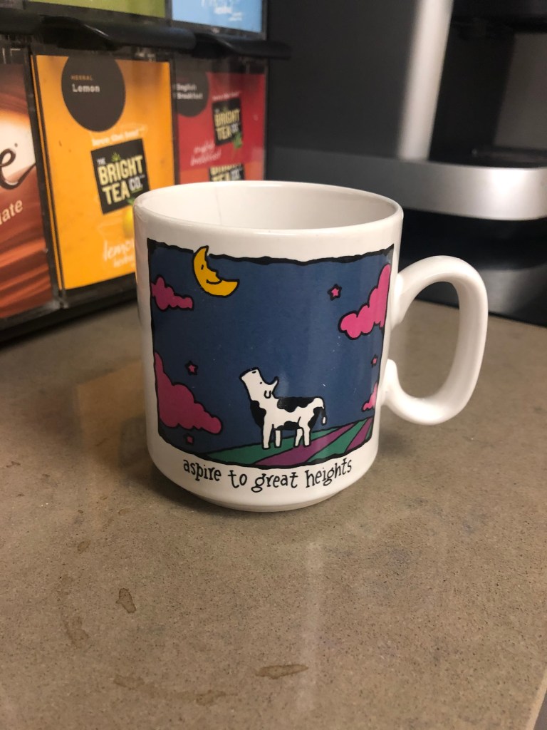 As a small-town, family-owned pharmacy, the store carried a lot more than medication. They stocked all sorts of collectibles and figurines – from Precious Moments to the Dickens’ Christmas Village. They had a lot of gifts and trinkets: coffee mugs and stuffed toys and lots of seasonal decorations. These were the items that made up the majority of the Sidewalk sale, and I still have a mug that I snagged from one. It’s been a favourite from my early teen years, following me to college, surviving several moves: California to Minnesota to Wisconsin to Toronto. It’s white with a little cartoon scene of a cow, staring up at the moon, with the words “aspire to great heights.”