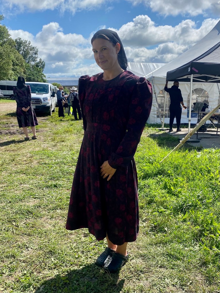 On the designated morning, I drove out to a rural farm and joined my fellow background actors in event tents designated for costumes and hair. All of the dresses were sewn by women from the Mennonite community, and I was assigned one to try on. In my first attempt I actually put it on backwards, and giggled with the costume lady who helped me adjust. Next was a pair of white cotton socks and black Crocs. While some aspects of the movie and costuming may feel like a period piece, in reality, the story takes place in the early 2000s and apparently the Mennonites wear Crocs. Who knew?