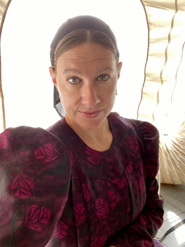 Next up was a quick stop in the very limited make-up department to have a tattoo on my wrist covered up. While it should be entirely covered by the long sleeves of my Mennonite dress, they were taking no chances. Following my tattoo make-up, I met an incredibly joyful hair artist who tied off my braids with string before winding them together at the base of my neck and then covering my head with a black mesh scarf.